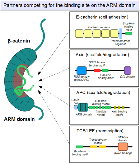 As sketched above, the ARM domain of β-catenin acts as a platform to which specific linear motifs may bind. Located in structurally diverse partners, the β-catenin binding motifs are typically disordered on their own, and typically adopt a rigid structure upon ARM domain engagement – as seen for short linear motifs. However, β-catenin interacting motifs also have a number of peculiar characteristics. First, they might reach or even surpass the length of 30 amino acids in length, and contact the ARM domain on an excessively large surface area. Another unusual feature of these motifs is their frequently high degree of phosphorylation. Such Ser/Thr phosphorylation events greatly enhance the binding of many β-catenin associating motifs to the ARM domain.[16]