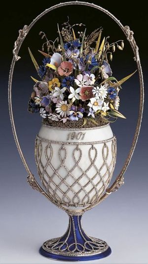 وكان على ألكسندر الثالث لتنفيذ فكرته أن يجد الصائغ الماهر ولديه الحس الفني كي يستطيع ان يصنعها على اجمل ما يكون. في ذلك الوقت كان هناك صائغ يدعى فابرجيه اسمه كاملا بيتر كارل فابرجيه ـ من مالكي الشركة الأصلية المؤسسة على يد جوستاف فابرجيه عام 1842م ـ المولود في سانت بطرسبرج «ليننجراد سابقاً» في روسيا عام 1846م وتعلم أسرار المهنة على يد والده حيث ورث عنه تجارة العائلة وتوسع فيها في سن الرابعة والعشرين واصبحت لديه شركته الخاصة ومصانعها في العديد من المدن الروسية منها كييف وموسكو وأوديسا وسانت پطرسبورگ وفي خارج روسيا لندن بالمملكة المتحدة، ولقد اختاره القيصر الكسندر الثالث وعينه في البلاط الامبراطوري عام 1884م. وكان شرط ألكسندر الوحيد في صناعة فابرجيه لهديته احتواؤها على مفاجأة بداخلها وبالفعل نفذها فابرجيه باتقان ومهارة شديدة فهو ذو الشهرة العالمية في تصميم وزخرفة علب السجائر ومقابض المظلات النسائية والأزهار والمنمنمات الذهبيةوالساعات وغيرها. وفي عيد الفصح قدم القيصر ألكسندر الثالث هديته الثمينة بيضة من المينا والذهب مرصعة بالأحجار الكريمة والألماس للإمبراطورة ماريا فدوروفنا التي سرت بها سرروا كبيرا ومنذ ذلك الوقت أصبحت هذه الهدية تقليداً عائليأ امبراطورياً لقياصرة الإمبراطورية الروسية ظل حتى الثورة البلشفية عام 1917م.[1]