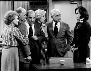 مشهد من الحلقة الأخيرة من ذا ماري تايلر مور شو (من اليسار): وايت، گيڤن مكليود، إد أسنر، جورجيا أنجل، تد نايت، وماري تايلر مور.