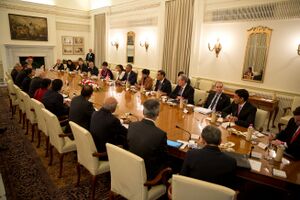 Hyderabad House is an official residence in New Delhi, India. It is the State Guest House of the Prime Minister of India.[1] It is used by the Government of India for banquets, and as a venue for meetings with visiting foreign dignitaries.[2] It was designed by British architect Edwin Lutyens as a residence for Mir Osman Ali Khan, the last Nizam of Hyderabad.[3][4]