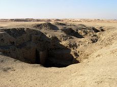 The largest tomb, K1, rises 8 metres above the desert and covers an area of over 3800 square meters.[1] It was surrounded by a two metre thick outer wall, with brickwork around the pits and corners. The burial shaft lies 25 metres below the surface at the bottom of a stairway which was blocked by six massive stones.[2] The ceiling above the stairway was constructed of descending barrel vaults supported by mud brick arches and are thought to be the oldest known vaults in Egypt.[1] Nearly 800 cylindrical alabaster vases were removed from the stairway, including some with mud caps sealed with the name of 'Neter-Khet' (Netjerikhet).[2] The burial chamber comprised 18 chambers leading out from a central passage.[2] حفرَ ناهبو القبور حفرة صغيرة تحت المصطبة وبعثروا العظام وأوعية القرابين.[2] The second largest tomb, K2, was of a similar design to K1, contained human remains and a small fragment inscribed with the name of 'Hen-nekht' or 'sa-nekht' (Sanakht).[2]
