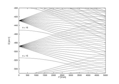 The perturbative treatment of the Stark effect has some problems. In the presence of an electric field, states of atoms and molecules that were previously bound (square-integrable), become formally (non-square-integrable) resonances of finite width. These resonances may decay in finite time via field ionization. For low lying states and not too strong fields the decay times are so long, however, that for all practical purposes the system can be regarded as bound. For highly excited states and/or very strong fields ionization may have to be accounted for. (See also the article on the ذرة ريدبرگ).