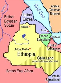 وأقنعت فرنسا عام 1892 ملك إثيوبيا بالموافقة على مد خط للسكة الحديدية يربط عاصمته الجديدة أديس أبابا بميناء جيبوتي، وكان هدفها الحقيقي من ذلك أن يمتد هذا الخط فيما بعد غرباً ليصلها بمستعمرتها الكونغو - برازافيل. ولم تقنع إيطاليا بحصتها من الغنيمة - وهي أريترية، وعلى الرغم من اعتراف إثيوبيا في معاهدة أوشيالي Uccialli أو Wuchali عام 1889 بالسيادة الإيطالية هناك زحفت جيوش إيطالية نحو الداخل، فتصدّى لها الملك وخاض معارك كثيرة حتى ألحق بها هزيمة ساحقة في عدوة Adawa عام 1896، وقد قدم الفريق صادق المؤيد العظم الذي زار إثيوبيا عام 1904 لينقل رسالة ودية من السلطان العثماني عبد الحميد الثاني إلى منليك - في كتاب وضعه عن مهمته هناك - عرضاً وافياً لهذه المعارك جميعها. على أن منليك عاد فأبرم معاهدة مع الدول الاستعمارية الثلاث تمنحها امتيازات كثيرة بينها استمرار السيادة الإيطالية على أريتريا، فلمّا توفي عام 1913 - بعد مرض عضال دام سبع سنوات - خلفه ولي عهده ليج اياسو Lij Iyasu وكان عمره ستة عشر عاماً. وتودد الحاكم الجد إلى مسلمي إثيوبية - وأعلن إسلامه - فقام ضده تحالف مؤلف من الكنيسة وزعماء الأقاليم والدول الاستعمارية تمكن من خلعه عام 1916 قبل أن يجري تتويجه، فخلفته زوديتو Zauditu ابنة منليك على أن يكون الأمير الشاب تفاري Tafari - الذي كان أبوه ابن عم لمنليك - وصياً على العرش وولياً للعهد.