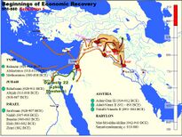 Through decades of military conquests, the early Neo-Assyrian kings worked to retake the former lands of their empire[109] and re-establish the position of Assyria as it was at the height of the Middle Assyrian Empire.[110] The reigns of Adad-nirari II (ح. 911–891 BC) and Tukulti-Ninurta II (ح. 890–884 BC) saw the slow beginning of this project.[111] Since the reconquista had to begun nearly from scratch, its eventual success was an extraordinary achievement.[112] Adad-nirari's most important conquest was the reincorporation of the city of Arrapha (modern-day Kirkuk) into Assyria, which in later times served as the launching point of innumerable Assyrian campaigns to the east. Adad-nirari also managed to secure a border agreement with the Babylonian king Nabu-shuma-ukin I, a clear indicator that Assyrian power was on the rise.[113] The second and more substantial phase of early Neo-Assyrian expansion began under Tukulti-Ninurta's son Ashurnasirpal II (ح. 883–859 BC), whose conquests made the Neo-Assyrian Empire the dominant political power in the Near East.[114]