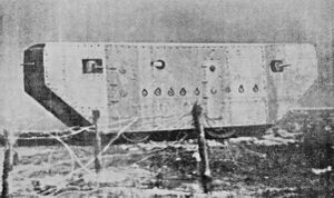 H. G. Wells, in his short story The Land Ironclads, published in The Strand Magazine in December 1903,[12] had described the use of large, armed, armoured cross-country vehicles equipped with pedrail wheels (an invention which he acknowledged as the source for his inspiration),[13] to break through a system of fortified trenches, disrupting the defence and clearing the way for an infantry advance: