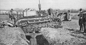 When World War I broke out, with the problem of trench warfare and the difficulty of transporting supplies to the front, the pulling power of crawling-type tractors drew the attention of the military.[23] Holt tractors were used to replace horses to haul artillery and other supplies. The Royal Army Service Corps also used them to haul long trains of freight wagons over the unimproved dirt tracks behind the front. Holt tractors were, ultimately, the inspiration for the development of the British and French tanks.[22][24]