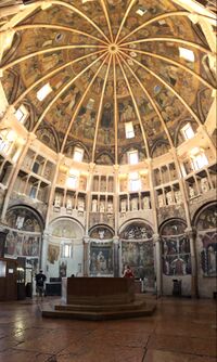 Churches in northern Italy after 1100 were designed with vaulting from the outset, rather than as colonnaded basilicas with timber roofs and, like the Rhenish imperial cathedrals, many have octagonal domes with squinches over their crossings or choirs. Examples include Parma Cathedral, rebuilt around 1130, and Piacenza Cathedral (1122-1235).[105] Another example is the domed church of San Fedele in Como (11th to 12th century), similar to the church of St. Maria im Kapitol. The Baptistery of Parma, one of the largest baptisteries, was begun in 1196 and has dome frescoes dating from 1260 onwards.[66]