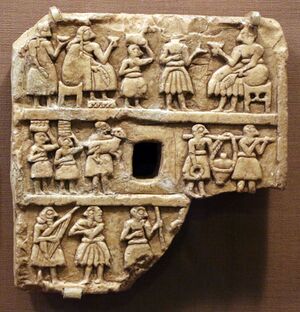 The Jemdet Nasr period, named after the type-site Jemdet Nasr, is generally dated to 3100–2900 BC.[40] It was first distinguished on the basis of distinctive painted monochrome and polychrome pottery with geometric and figurative designs.[41] The cuneiform writing system that had been developed during the preceding Uruk period was further refined. While the language in which these tablets were written cannot be identified with certainty for this period, it is thought to be Sumerian. The texts deal with administrative matters like the rationing of foodstuffs or lists of objects or animals.[42] Settlements during this period were highly organized around a central building that controlled all aspects of society. The economy focused on local agricultural production and sheep-and-goat pastoralism. The homogeneity of the Jemdet Nasr period across a large area of southern Mesopotamia indicates intensive contacts and trade between settlements. This is strengthened by the find of a sealing at Jemdet Nasr that lists a number of cities that can be identified, including Ur, Uruk and Larsa.[43]