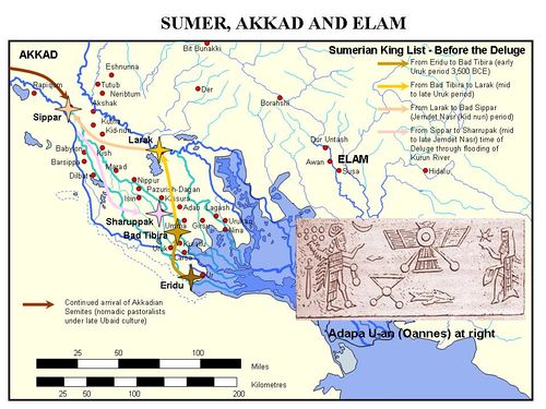 إذا عدنا إلى خريطة الشرق الأدنى وتتبعنا المجرى المشترك المكون من نهري دجلة و الفرات من مصبه في الخليج الفارسي إلى أن ينفصل المجريان عند بلدة القرنة الحديثة ، ثم تتبعنا نهر الفرات متجهين إلى الغرب ، وجدنا في شماله وجنوبه المدن السومرية القديمة المطمورة هي: إريدو "أبوشهرين الحديثة" و أور "المُقَيَّر الحديثة" وأورك "وهي المسماة إرك في التوراة والمعروفة الآن باسم الوركاء" ولارْسا "المسماة في التوراة بإسم إلاسار والمعروفة الآن بإسم "سنكرة" و لگش "سيبرلا الحديثة" و نبور "نفر". تتبع بعدئذ نهر الفرات في سيره نحو الشمال الغربي إلى بابل التي كانت في يوم من الأيام أشهر بلاد الجزيرة "أرض ما بين النهرين" تجد إلى شرقها مباشرة بلدة كش مقر أقدم ثقافة عرفت في هذا الإقليم ، ثم سر بعدئذ مع النهر صعدا قرابة ستين ميلا حتى مقر أجاد قصبة مملكة أكد في الأيام الخالية. ولم يكن تاريخ أرض الجزيرة القديم من إحدى نواحيه إلا صراعا قامت به الشعوب غير السامية التي تسكن بلاد سومر لتحتفظ بإستقلالها أمام الهجرات السامية والزحف السامي من كش وأجاد وغيرهما من مراكز العمران الشمالية. وكانت هذه الأجناس المختلفة الأصول في خلال هذا الصراع تتعاون دون أن تشعر بتعاونها- ولعلها كانت تتعاون على الرغم منها- لتقيم صرح حضارة هي أول ما عرف من حضارة واسعة شاملة فذة ، وهي من أعظمها إبداعا وإنشاء. وليس في وسعنا رغم ما قام به العلماء من بحوث أن نعرف إلى أية سلالة من السلالات البشرية ينتمي هؤلاء السومريون ، أو أي طريق سلكوه حتى دخلوا بلاد سومر. ومن يدري لعلهم جاءوا من آسيا الوسطى أو من بلاد القفقاس أو من أرمينية وإخترقوا أرض الجزيرة من الشمال متتبعين في سيرهم مجريي دجلة والفرات- حيث توجد- كما في أشور مثلا شواهد دالة على ثقافتهم الأولى. أو لعلهم قد سلكوا الطريق المائي من الخليج الفارسي- كما تروي الأساطير- أو من مصر أو غيرها من الأقطار ، ثم إتخذوا سبيلهم نحو الشمال متتبعين على مهل النهرين العظيمين. أو لعلهم جاءوا من السوس حيث يوجد بين آثارها رأس من الأسفلت فيه خواص الجنس السومري كلها. بل إن في وسعنا أن نذهب إلى أبعد من هذا كله فنقول إنهم قد يكونون من أصل مغولي قديم موغل في القدم. ذلك بأن في لغتهم كثيراً من التراكيب الشبيهة بلسان المغول. لكن علم هذا كله عند علام الغيوب.