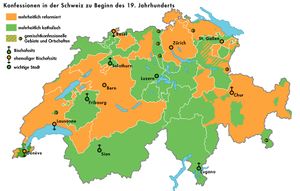 The Radical–liberal–Protestant element charged that the Sonderbund violated the Federal Treaty of 1814, § 6 of which expressly forbade such separate alliances. Forming a majority in the Tagsatzung they decided to dissolve the Sonderbund on October 21, 1847.[2][3] The odds were against the Catholics, who were heavily outnumbered in population; they were outnumbered in soldiers by 79,000 to 99,000 and lacked enough well-trained soldiers, officers, and generals. When the Sonderbund refused to disband, the national army attacked in a brief civil war between the Catholic and the Protestant cantons, known as the Sonderbundskrieg ("Sonderbund War".) The national army was composed of soldiers from all the other cantons except Neuchâtel and Appenzell Innerrhoden (which remained neutral). The Sonderbund was easily defeated in less than a month; there were about 130 killed. Apart from small riots, this was the last armed conflict on Swiss territory.[4] Many Sonderbund leaders fled to Italy, but the victors were generous. They invited the defeated cantons to join them in a program of federal reform, and a new constitution was drafted along American lines. National issues were to be under the control of the national parliament, and the Jesuits were expelled. The Swiss voted heavily in favor of the new constitution by 2 million against 300,000. Switzerland became calm. However, conservatives around Europe became frightened and prepared their forces to meet possible challenges, which indeed soon exploded the Revolutions of 1848. In those violent revolutions, outside Switzerland, the conservatives were always successful.[5]