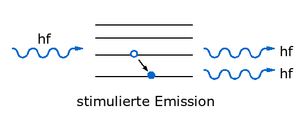يتميز الاصدار المحفز بذرة مثارة تتفاعل مع فوتون ساقط عليها ذو طاقة مناسبة لها ، فيحفزها على اصدار فوتون ثاني ويكون الفوتنين (الساقط والمحفز ) في نفس الطور والاتجاه .