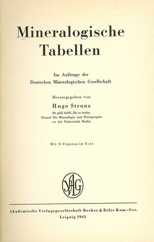 As curator of the Mineralogical Museum of Friedrich-Wilhelms-Universität (now known as the Humboldt University of Berlin), Strunz had been tasked with sorting the museum's geological collection according to crystal-chemical properties.[1] His book Mineralogical Tables, has been through a number of modifications; the most recent edition, published in 2001, is the ninth (Mineralogical Tables by Hugo Strunz and Ernest H. Nickel (31 August 1925 – 18 July 2009)).[2][3] The IMA/CNMNC supports the Nickel–Strunz database.[4]