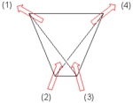 Similarly in three dimensions, four spins arranged in a tetrahedron (Figure 2) may experience geometric frustration. If there is an antiferromagnetic interaction between spins, then it is not possible to arrange the spins so that all interactions between spins are antiparallel. There are six nearest-neighbor interactions, four of which are antiparallel and thus favourable, but two of which (between 1 and 2, and between 3 and 4) are unfavourable. It is impossible to have all interactions favourable, and the system is frustrated.