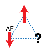 Geometrical frustration is an important feature in magnetism, where it stems from the relative arrangement of spins. A simple 2D example is shown in Figure 1. Three magnetic ions reside on the corners of an equilateral triangle with antiferromagnetic interactions between them; the energy is minimized when each spin is aligned opposite to neighbors. Once the first two spins align antiparallel, the third one is frustrated because its two possible orientations, up and down, give the same energy. The third spin cannot simultaneously minimize its interactions with both of the other two. Since this effect occurs for each spin, the ground state is sixfold degenerate. Only the two states where all spins are up or down have more energy.
