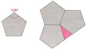 But now, the interaction energy is supposed to be at a minimum when atoms sit on the vertices of a regular pentagon. Trying to propagate in the long range a packing of these pentagons sharing edges (atomic bonds) and vertices (atoms) is impossible. This is due to the impossibility of tiling a plane with regular pentagons, simply because the pentagon vertex angle does not divide 2π. Three such pentagons can easily fit at a common vertex, but a gap remains between two edges. It is this kind of discrepancy which is called "geometric frustration". There is one way to overcome this difficulty. Let the surface to be tiled be free of any presupposed topology, and let us build the tiling with a strict application of the local interaction rule. In this simple example, we observe that the surface inherits the topology of a sphere and so receives a curvature. The final structure, here a pentagonal dodecahedron, allows for a perfect propagation of the pentagonal order. It is called an "ideal" (defect-free) model for the considered structure.