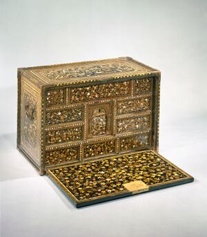 Nonetheless, numerous other items were also transactioned, such as gold, Chinese porcelain, musk, and rhubarb; Arabian horses, Bengal tigers and peacocks; fine Indian scarlet cloths, calico and chintz; European manufactured items such as Flemish clocks and Venetian glass and Portuguese wine and rapiers;[11][11] in return for Japanese copper, lacquer and lacquerware or weapons (as purely exotic items to be displayed in Europe).[11] Japanese lacquerware attracted European aristocrats and missionaries from Europe, and western style chests and church furniture were exported in response to their requests.[13]
