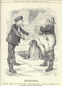فقد كانت أثمن قطعان في العالم من الفقمة تعيش حول جزر بريبلوف في بحر بيرنج. وقد حصلت الولايات المتحدة على تلك الجزر من روسيا عام 1867. وفي عام 1870، حاولت الولايات المتحدة حماية الفقمة بتحديد العدد الذي يمكن اصطياده سنويًا، وبمنح امتياز الصيد لشركة واحدة فقط. ولكن نظرًا لأن المياه الإقليمية للولايات المتحدة لم تكن تمتد إلا لمسافة ثلاثة أميال بحرية (5.5 كم) من سواحل الجزر، فقد قام الصيادون الكنديون، والمكسيكيون، والروس واليابانيون والأمريكيون، بالإبحار بالقرب من تلك الجزر واصطياد إناث الفقمة عند خروجها للمحيط. ونتيجة لذلك أعلنت الولايات المتحدة بسط سيطرتها على بحر بيرنج بأكمله. واعترضت بريطانيا على ذلك الإجراء وتم تحويل الخلاف إلى محكمة دولية.