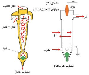ط ـ الترسيب الكهربائي electrical precipitation كحذف الغبار بطريقة كوترل cottrel المستعملة في تنقية جو المناطق الصناعية، وذلك في مداخن المصانع، ويتم ذلك بتعليق سلك (الشكل -3)، وشحنه بالكهرباء، فينشأ بذلك حقل (يؤين) الهواء المحيط، فتنشحن الدقائق بتماسها للسلك ثم تتحرك منتقلة إلى جدار المدخنة حيث تتفرغ كهربائياً وتترسب.