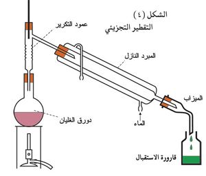جـ ـ التقطير التجزيئي fractional distillation لمزيج سائل، كما في تجزئة النفط والسوائل الغولية والهواء السائل، وذلك بإدخال البخار الخارج من المزيج السائل عند الغليان إلى برج تكرير rectification فيغتني البخار ويتنقى خلال التقطير عند تماسه وتآثره بتيار السائل المتكثف من البخار والهابط في الاتجاه المعاكس (التقطير المرتد reflux). وعندما تمس الأجزاء من البخار الأقل تطايراً الصواني المتطبقة بعضها فوق بعض في البرج فهي تتكثف عائدة إلى المرجل، في حين تستمر الأجزاء الأكثر تطايراً بالصعود فتُجمع وتُكثف (الشكل -4).