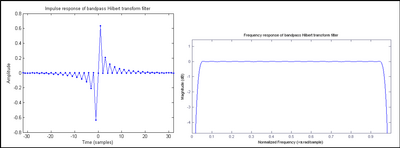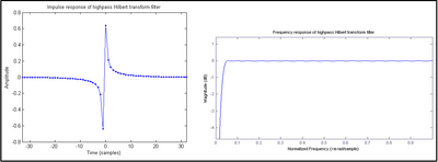 which is an infinite impulse response (IIR). When the convolution is performed numerically, an FIR approximation is substituted for h[n], as shown in Figure 1. An FIR filter with an odd number of anti-symmetric coefficients is called Type III, which inherently exhibits responses of zero magnitude at frequencies 0 and Nyquist, resulting in this case in a bandpass filter shape. A Type IV design (even number of anti-symmetric coefficients) is shown in Figure 2. Since the magnitude response at Nyquist does not drop out, it approximates an ideal Hilbert transformer a little better than the odd-tap filter. However: