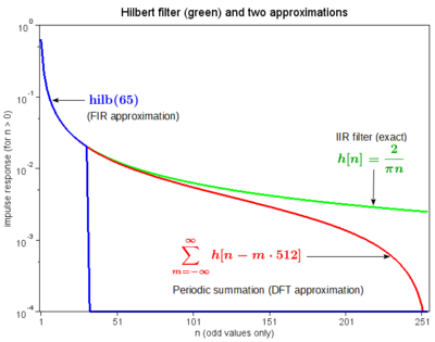 and returns one cycle (N samples) of the periodic result in the imaginary part of a complex-valued output sequence. The convolution is implemented in the frequency domain as the product of the array with samples of the −i•sgn(ω) distribution (whose real and imaginary components are all just 0 or ±1). Figure 3 compares a half-cycle of hN[n] with an equivalent length portion of h[n]. Given an FIR approximation for denoted by substituting for the −i•sgn(ω) samples results in an FIR version of the convolution.