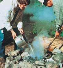 يجب التأكد من إطفاء النار قبل مغادرة المخيم. ولإطفاء النار ينشر الرماد الحار الخامد ويغطى بالتراب. يحرك الخليط ويبعثر على الأرض ويغطى بالتراب مرة أخرى. وفي الأماكن التي ليس بها مواضع مخصصة لإشعال النار يجب إزالة كافة بقايا النار.