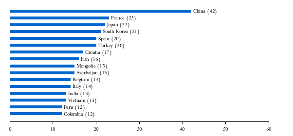 الترتيب | البلد | عدد عناصر التراث الثقافي الغير مملوس[17] |