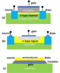 Figure 1. Schematic of three kinds of field-effect transistor (FET): (a) metal-insulator-semiconductor FET (MISFET); (b) metal-semiconductor FET (MESFET); (c) thin-film transistor (TFT).