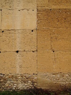 In Europe, especially in France, Britain and Germany, traditional rammed earth is experiencing a resurgence in contemporary architecture.[20] Several modern buildings have been constructed using traditional rammed earth techniques, including notable examples such as a three-storey home built in Austria in 2008.[20] Historically, rammed earth (known as "pisé de terre" in French) was a common building technique in parts of Europe, particularly in rural areas where access to other building materials was limited. Many historical rammed earth structures still remain throughout Europe, particularly in France, Spain, and Germany, demonstrating the durability of the technique when properly maintained.[20] The modern European revival of rammed earth is closely tied to the growth of sustainable architecture movements and interest in traditional building techniques. Contemporary European rammed earth buildings are often designed as showcase projects that demonstrate the aesthetic and environmental qualities of the material, though they remain relatively rare compared to conventional construction methods.