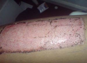 ![]() Skin graft on lower leg trauma injury, 5 days after surgery healing aided by use of a vacuum dressing | |