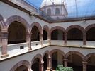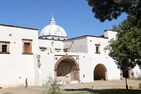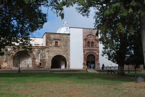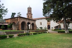 The cloister area was built mostly in the 17th century, with the walls painted in murals from different eras, as well as a wood relief carving that represents piety. Next to this cloister is a second, larger open chapel with a presbytery and a transversal gallery.[9] The complex's atrium is a large, park-like setting and is named the Atrium of the Olive Trees.[14] This is due to the large gnarly trees that were planted here by Vasco de Quiroga,[2] and supposedly have never borne fruit.[11]