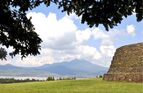 The pre-Hispanic city of Tzintzuntzan extended from Lake Pátzcuaro to the hills just to the east and had a population of between 25,000 and 30,000 when the Spanish arrived in the 1520s.[5] The city lost most of its population after the Conquest,[1] and what is now called the Tzintzuntzan archeological site is only the ceremonial center and is located one km east of the current center of the town. The site is located on a hill that overlooks the modern town and Lake Pátzcuaro. It is situated on a large artificial platform that was excavated into the side of the hill. The ceremonial center contains a large plaza and several buildings known to house priests and nobility, but the main attraction is the five yácatas or semi-circular pyramids that face out over the lake area.[6] This ceremonial center was called Taríaran or "House of the Wind". On each of the yacatas was a temple made of wood, in which the most important rites of the Purépecha people and government took place, including burials, of which about sixty have been found.[5] These are the best known Purépecha yacatas and are considered to be an icon of the region.[7]
