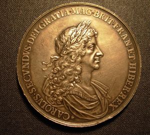 وسام سكه في 1667 جون روتيير لتخليد الحرب الإنگليزية الهولندية الثانية، تُظهر الألقاب الكاملة لتشارلز الثاني على الطرف.
