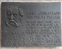 He was born Karl Christian Friedrich[1][2] to Karl Frederick Pfizer and Caroline Klotz. Like his older cousin, future business partner and brother-in-law, Karl Erhart, Pfizer was born in Ludwigsburg, Kingdom of Württemberg[3] (now Germany).[4] During his early years, he worked as an apothecary's apprentice.[5] He emigrated to the United States in October 1848.[6]