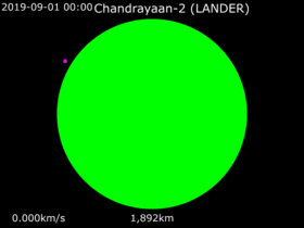 هبوط مركبة الإنزال ڤيكرام | 2 سبتمبر 2019 7:45 UTC | انفصال ڤيكرام | 127 km (79 mi) | 119 km (74 mi) | [56] | |
