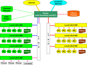Typical library network, in a branching tree topology and controlled access to resources