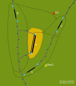 المَدرج الرئيسي (H) والمدارج القصيرة (B, C و D) طريق عمومي مئزر المدرج مواقع خط الطيران (hardstands) KC, مركز القيادة BasC، مركز القاعدة |