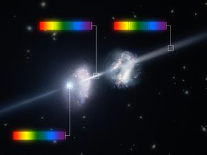 This artist's impression shows two galaxies in the early universe. The brilliant explosion on the left is a gamma-ray burst. As the light from the burst passes through the two galaxies on the way to Earth (outside the frame to the right), some colours are absorbed by the cool gas in the galaxies, leaving characteristic dark lines in the spectrum. Careful study of these spectra has allowed astronomers to discover that these two galaxies are remarkably rich in heavier chemical elements.