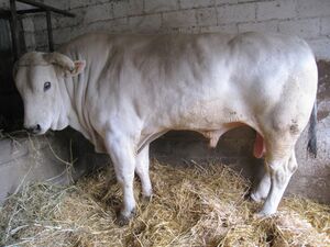 From 1931 breeders began to favour selection of animals more suited to meat production, with shorter limbs, longer bodies and more heavily muscled rump and thighs; in the twenty-first century selection is based also on factors such as growth rate, meat yield and – in cows – maternal ability.[6] While one source reports a herd-book dating from 1856,[10] others date the institution of the Libro Genealogico ('genealogical herdbook') to 1933, when a breed standard was established and commissions were set up by the then Ministero dell'Agricoltura e delle Foreste, the Italian ministry of agriculture,) to identify, mark and register morphologically suitable animals; the standard of the Chianina breed was fixed by ministerial decree of 7 August 1935.[11] A private register was previously kept by the largest cattle breeder of the Sienese Valdichiana, the Eredi del conte Bastogi of Abbadia di Montepulciano,[11] and a group of breeders had in 1899 formed a society, the Società degli Agricoltori della Valdichiana, of which a principal aim was the establishment of a herd-book.[12][13] Another herd-book was started in 1963, and remains active.[14][2]