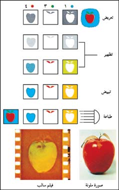 وأثناء تعريض الفيلم الملون تسقط الأشعة الضوئية على الطبقة الأولى من المستحلب، فيتكون خيال للمناطق الزرقاء من المنظر، وبعد ذلك تمر هذه الأشعة إلى الطبقة الثانية فيتكون خيال للمناطق الخضراء، وأخيرًا يمر الضوء من خلال الطبقة الثالثة مسجِّلاً خيالاً للمناطق الحمراء، وبذلك تتكون داخل الفيلم ثلاث خيالات كامنة.