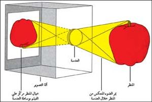 عندما ينفتح الغالق يمر الضوء المنعكس على المنظر من خلال الحدقة ليكوِّن خيالاً للمنظر على الفيلم، حيث تمر الأشعة الضوئية الصادرة من الجزء العلوي من المنظر من خلال الحدقة لتقع على الجزء الأسفل من الفيلم، أما أشعة الجزء الأسفل من المنظر، فهي التي تكوِّن الجزء الأعلى من الخيال، لذلك يظهر الخيال مقلوبًا على الفيلم.