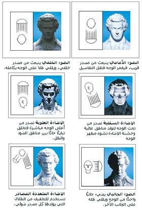 الإضاءة الخارجية الشمس هي المصدر الرئيسي للضوء في أغلب الصور المسجلة في الخارج. فعندما يكون المنظر مواجهًا للشمس يضاء الوجه بوضوح، ولكنه قد يدفع من نصوره إلى إغماض عينيه قليلا. ويشكل ضوء الشمس ظلالاً على الجانب الآخر عندما يسقط على أحد جوانب المنظر. هذه الظلال يمكن غمرها بالضوء باستخدام مصباح الوميض (الفلاش) أو أي مصدر ضوئي آخر. | ||