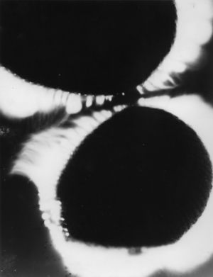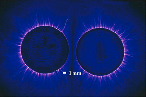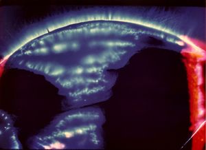 الصورة الكيرلية توضح إطلاقات الضوء المحيط بالجسم. وفي هذه الصورة الكيرلينية ليد بشرية، تظهر الإطلاقات في هيئة أطواق بيضاء وأرجوانية من الضوء.