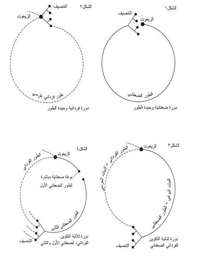 3ـ الدورة الثنائية الطور المكونة من تعاقب فردين أحدهما فرداني الصيغة الصبغية النووية وثانيهما ضعفاني الصيغة الصبغية النووية: ومثالها دورة حياة البريويات والتريديات والبذريات الموضحة في الشكل (3). تتكون الدورة الثنائية الطور في البريويات والتريديات والبذريات من تعاقب جيلين: جيل النبات البوغي sporophyte المكون من الخلايا الضعفانية الصيغة الصبغية النووية الناتجة من انقسام الخلايا الزيغوتية والمولد للأبواغ المنصفة, وجيل النبات العرسي gametophyte المكون من الخلايا الفردانية الصيغة الصبغية النووية الناتجة من انقسام الخلايا البوغية المنصفة، والمولد للأعراس الشكل (3)، وتدعى الدورة ثنائية التكوين digenetic الفرداني الضعفاني (متعاقبة الأجيال). يدعى هذا التسلسل (المكون من عضويتين رئيستين مختلفتين بعضهما عن بعض بالصيغة الصبغية: حيث الأولى فردانية الصيغة الصبغية النووية الخلوية والثانية ضعفانيتها) بتعاقب الأطوار phase alternation (المسمى تجاوزاً تعاقب الأجيال).