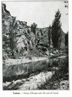 Guénin, in his "Notice sur les ruines de Tadmit",[2] points out that Tadmit was once a fairly important centre of occupation. The author describes numerous ruins of towns, villages, posts and defensive enclosures - without being able to attribute them to the Romans or the Berbers. There is no characteristic external evidence to establish the origin of the ruins at Tadmit; only the word et Tadmit would indicate by its sound that the Berbers occupied this point. However, as the Romans had established themselves in Messaâd (located in the same valley), and the ruins of Messaâd would resemble those of Tadmit, it would be possible that a Roman colony had come to settle in Tadmit. The remains of the ancient occupation are very visible. On the site of the [former] penitentiary a village was built; on the opposite bank of the 0ued-Tadmit there were traces of a real town. Both would have been stretched out by a real oppidum with a double enclosure wall, and the passes were guarded by reductions or by a kind of tower. Upstream from the bridge on the Takarzane road, there are still traces of isolated constructions; a square enclosure of about 100 metres on each side, and on both banks of the river, posts intended to protect the low-lying area where the inhabitants of the towns had established their crops.