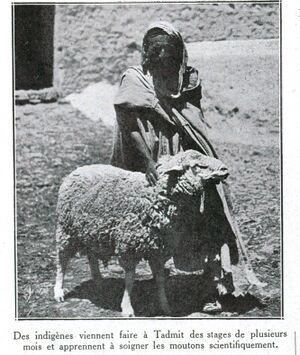 Following a study conducted in 1918 in the Djelfa region, it was decided to set up a sheep breeding station in Tadmit in 1922, in the former penitentiary.[8] The initial flock consisted of 600 animals, which was reduced to 250 by selection. Ten years later, the flock consisted of more than 2200 animals. The station allowed the selection and breeding of the breeds known as "Tadmit" (which is distinguished by the fineness of its wool), the variety known as "Raimbi" and that of "Zahrez".