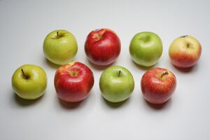 Apples are diploid, with two sets of chromosomes per cell (though triploid cultivars, with three sets, are not uncommon), have 17 chromosomes and an estimated genome size of approximately 650 Mb. Several whole genome sequences have been completed and made available. The first one in 2010 was based on the diploid cultivar 'Golden Delicious'.[19] However, this first whole genome sequence contained several errors,[20] in part owing to the high degree of heterozygosity in diploid apples which, in combination with an ancient genome duplication, complicated the assembly. Recently, double- and trihaploid individuals have been sequenced, yielding whole genome sequences of higher quality.[21][22]