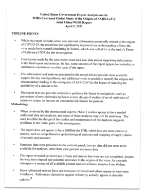 روى التقرير أيضًا كيف دحض شي نظريات المؤامرة وأخبر فريق الخبراء الزائر أنه "لم تكن هناك تقارير عن أمراض غير عادية ، ولم يتم تشخيص أي منها ، وخضع جميع الموظفين للاختبار سلبيًا بالنسبة للأجسام المضادة لـ SARS-CoV-2". تناقض بيانها بشكل مباشر النتائج التي تم تلخيصها في صحيفة الحقائق الصادرة عن وزارة الخارجية في 15 يناير. قال مسؤول سابق في الأمن القومي: "كانت تلك كذبة متعمدة من قبل أشخاص يعرفون أنها ليست صحيحة". وجد تحليل داخلي للحكومة الأمريكية لتقرير البعثة ، حصلت عليه فانيتي فير ، أنه غير دقيق بل ومتناقض ، حيث تقوض بعض الأقسام الاستنتاجات التي تم التوصل إليها في مكان آخر ، بينما يعتمد البعض الآخر على أوراق مرجعية تم سحبها. فيما يتعلق بالأصول الأربعة المحتملة ، ذكر التحليل ، فإن التقرير "لا يتضمن وصفًا لكيفية إنشاء هذه الفرضيات ، أو اختبارها ، أو كيفية اتخاذ قرار بينهما لتقرير أن أحدهما أكثر احتمالًا من الآخر". وأضافت أن حادثة معملية محتملة لم تتلق سوى نظرة "خاطفة" ، و "الأدلة المقدمة تبدو غير كافية لاعتبار الفرضية" غير مرجحة للغاية ".
