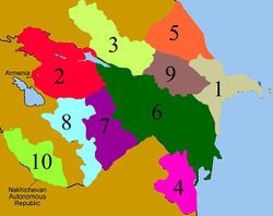 As a result of the Nagorno-Karabakh War, most of its territory is now under the control of ethnic Armenian forces from Nagorno-Karabakh and Armenia.[2] The self-proclaimed Nagorno-Karabakh Republic (NKR) also controls a large part of southwestern Azerbaijan outside Nagorno-Karabakh. The Azerbaijani rayons completely or partially in the NKR are noted in the list. The NKR does not recognise these rayons and has its own system of administrative division.