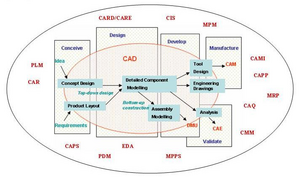 تدمج أدوات تقنيات بمساعدة الحاسوب المتقدمة العديد من الجوانب المختلفة لـ إدارة دورة حياة المنتج (PLM)، بما في ذلك التصميم، طريقة العناصر المتناهية (FEA)، والتصنيع، وتخطيط الإنتاج، والمنتج.